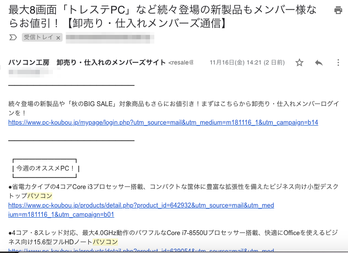 メルマガ会員に登録すると近隣の店舗のセール情報などが飛んできます。