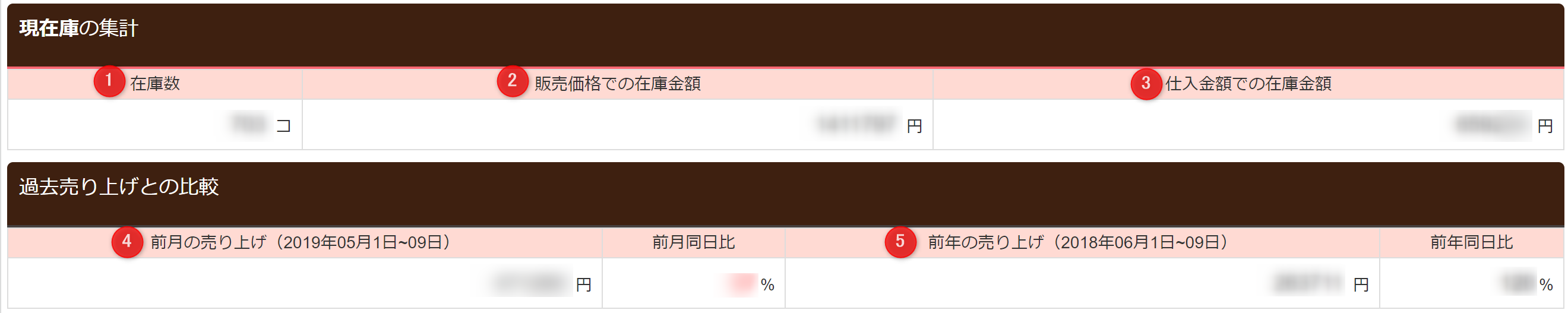 後に説明する「総在庫数や過去売上の確認」とは違い、指定期間の実績を確認できます。