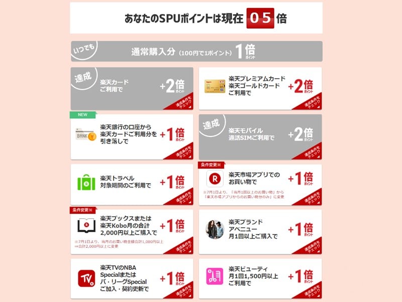 楽天の様々なサービスを利用することによって、ポイントの獲得倍率が上がるサービスです。